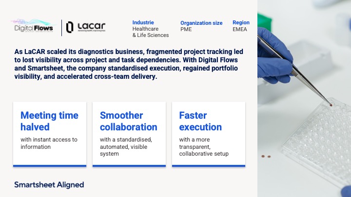 LaCAR implemented a structured and transparent project flow in Smartsheet, supported by Digital Flows, creating a unified system that manages all project phases—from feasibility to product launch. The solution combines detailed project workspaces with a portfolio-level overview, automated notifications, risk‑tracking formulas, and a quarterly project scoring system to prioritise initiatives effectively.